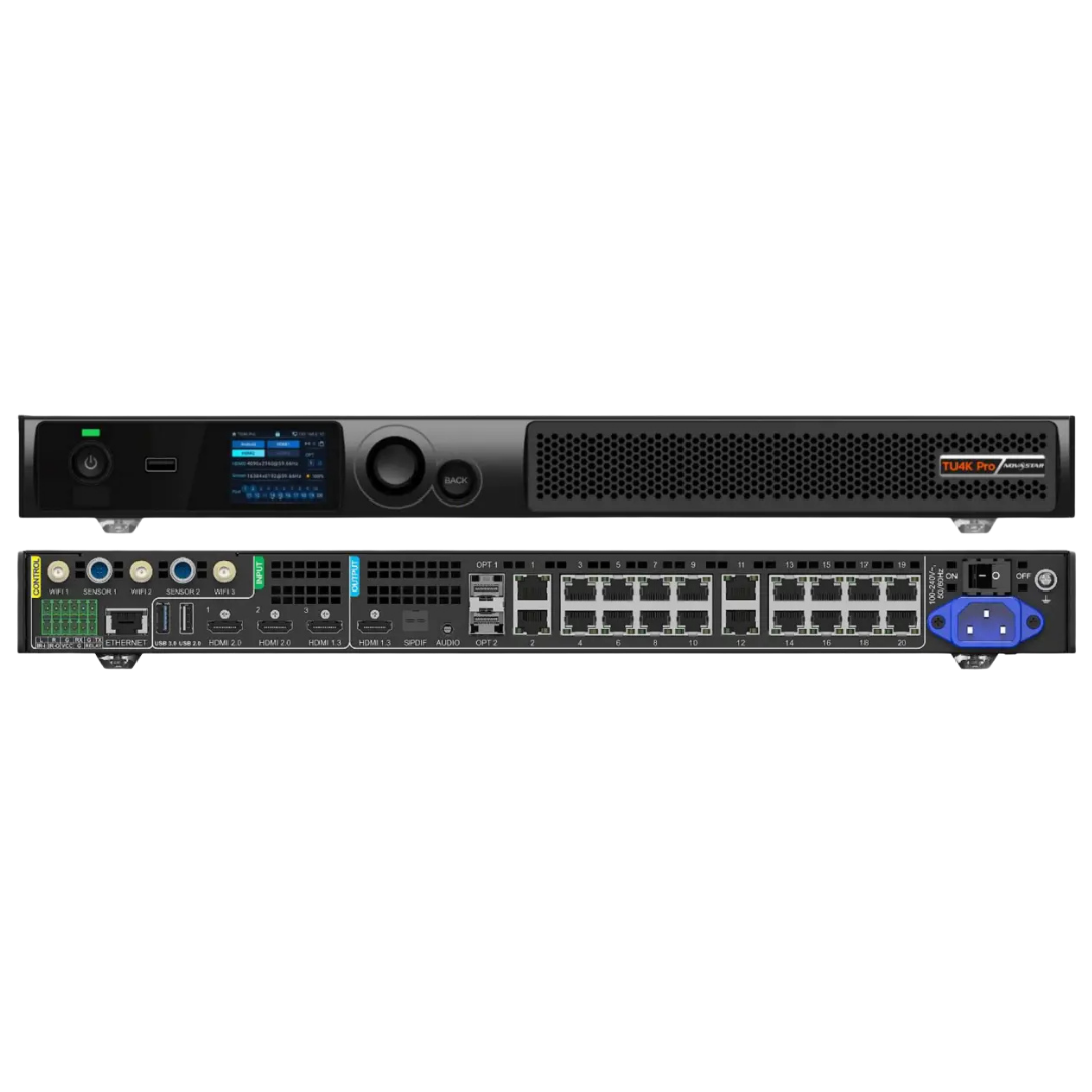 HDMI 2.0 Inputs (2x, up to 4K@60Hz) – HDMI 1.3 Input (1x, up to 2048×1152@60Hz) – HDMI 1.3 Output (1x, monitoring/debug only) – RJ45 Ethernet Outputs (20x, 1Gbps each) – Optical Fiber Outputs (2x, 10G OPT) – SPDIF Digital Audio Out – 3.5mm Audio Out – HDMI eARC Audio – Phoenix Audio Output – USB 3.0 (1x) – USB 2.0 (2x) – Output Image Scaling Built-In – EDID Management – HDCP 1.4 & 2.2 Compliant – Pixel-to-Pixel or Scaled Output (Max 13MP Scaled / 8.8MP Pixel-to-Pixel)